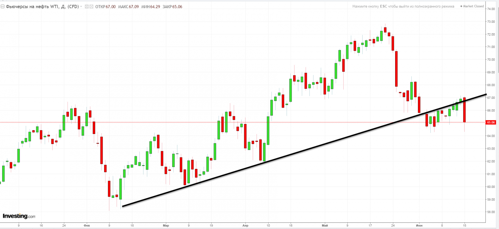 На графике видим, что нефть как и предполагалось так и не смогла уйти выше пробитого тренда и то что ретест продолжался целую неделю вылилось в обвальное падение на 4% в пятницу 15.06.18.