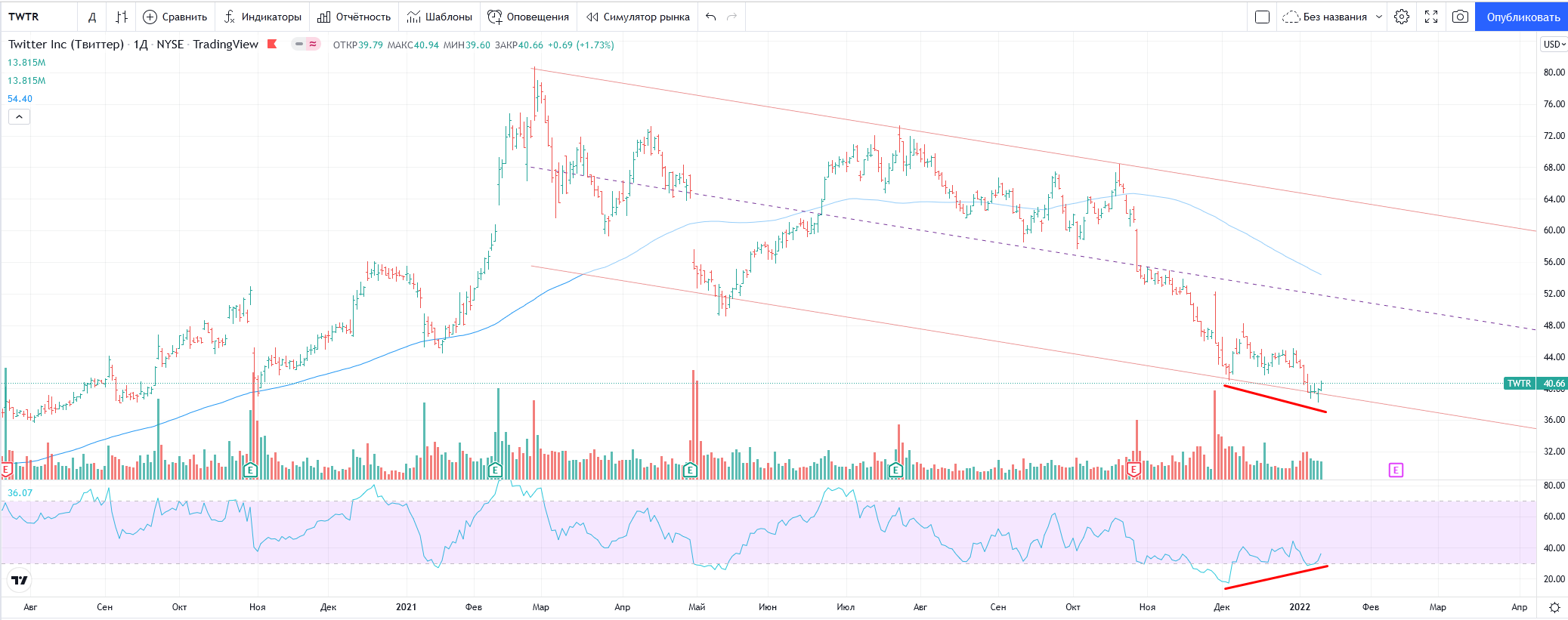 Всем доброго утра. Вчера просматривал акции Америки и нашел , что можно прикупить в среднесрок, думаю цена хорошая. Мысль проста : данный инструмент находится в коррекции с февраля 2021 года. Снижение от максимумов составило уже чуть более 50%. Так же актуален низходящий тренд, и сейчас цена как раз пытается оттолкнуться от его нижней границы. Плюс на дневном ТФ сформировалась "бычья" дивергенция по индикатору RSI.