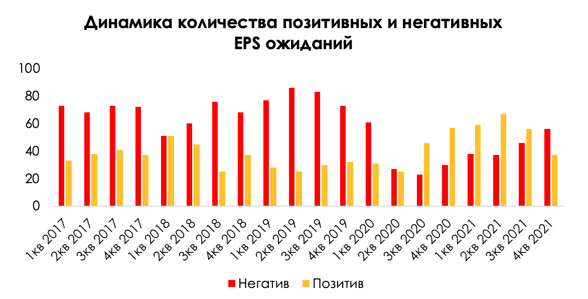 На фондовом рынке США наступает важное время, когда объем негативных прогнозов превысил впервые уровень положительных ожиданий со 2 кв. 2020 года. Основной причиной стало понижение ожиданий финансовых результатов технологических компаний, а именно они были ответственны за рост индекса широкого рынка в 2021 году. Мы считаем, что в условиях оттока ликвидности и повышения ставок инвестору нужно высоко диверсифицировать портфель качественными фишками во избежание излишней волатильности портфеля.