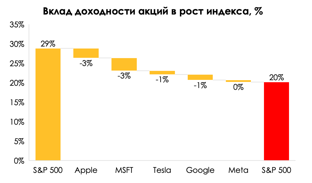 Это связано с тем, что основной рост S&P 500 в 2021 году был обязан IT c высокой капитализацией в лице Meta, Microsoft, Google, а также компаниям Apple и Tesla (около 20% от индекса). За 2021 год индекс S&P 500 вырос на 28,8%, однако без подсчета компаний выше с учетом их веса в индексе рост составил 20,2% за год.