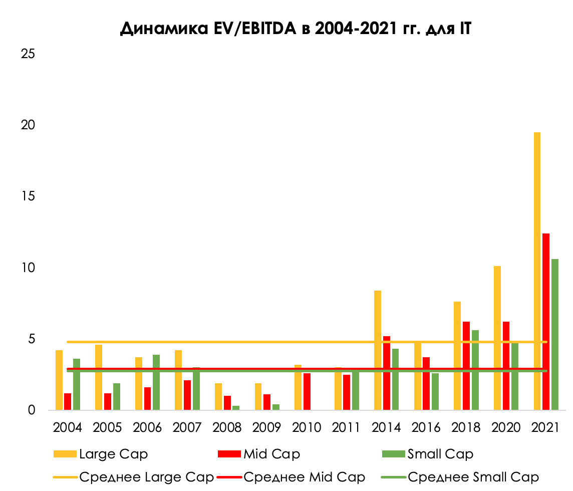 Вслед за ростом котировок раздулся и мультипликатор EV/EBITDA для компаний крупной капитализации в секторе информационных технологий в 2021, оказавшись в 2 раза выше 2020 года и практически в 5 раз выше среднего за 10 лет. Так же показали себя акции средней и малой капитализации. В свою очередь, рост ставок федерального резерва будет давить на акции с высокими мультипликаторами.