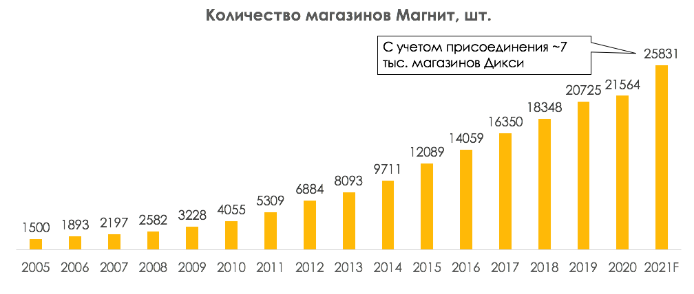 За 10 лет с 2005 г. Магниту удалось увеличить сеть магазинов в 8 раз и нарастить выручку в 21 раз. Средний ежегодный темп роста выручки в 2005-2015 гг. составлял 36%.
