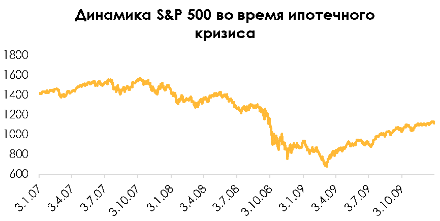Ипотечный кризис происходил в период с 2007 по 2008 год. При этом индекс резко упал после банкротства Lehman Brothers 15 сентября 2008 года.