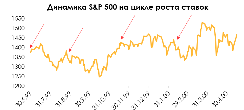 Сам по себе цикл роста ставок не является триггером для резкого падения индекса. В прошлых циклах ставка росла не с экстремально низких значений, как сейчас, и при более высокой безработице.