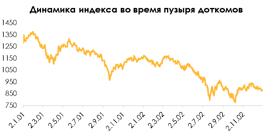 Рынок падал резко в 2008 году на значимом событии банкротства Lehman Brothers. В кризисе же доткомов такого значимого события не было. Индекс NASDAQ до крупного падения почти вдвое достиг исторического максимума, удвоившись за год. Но какого-то конкретного события не происходило.