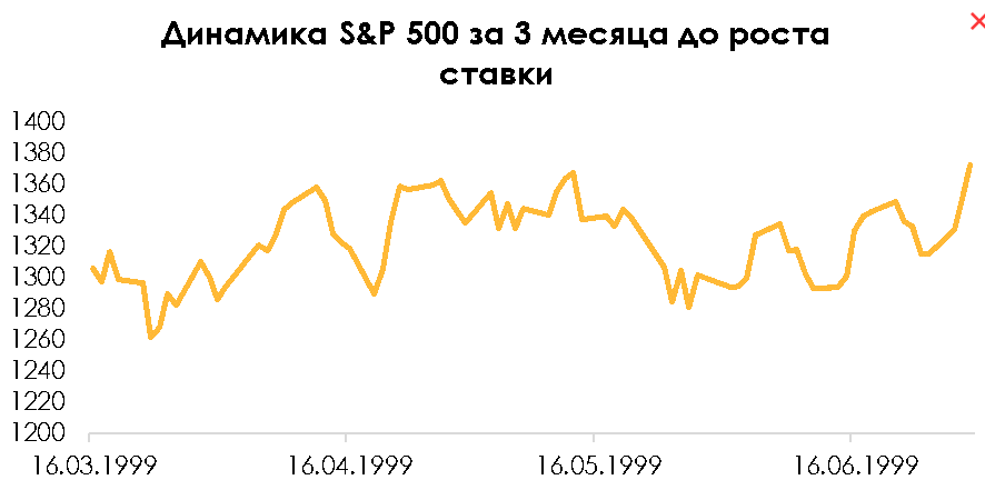 Динамика индекса за 3 месяца до подъёма ставки была положительной и не такой волатильной, как в аналогичный период кризиса доткомов. Индекс плавно вырос на 6%: