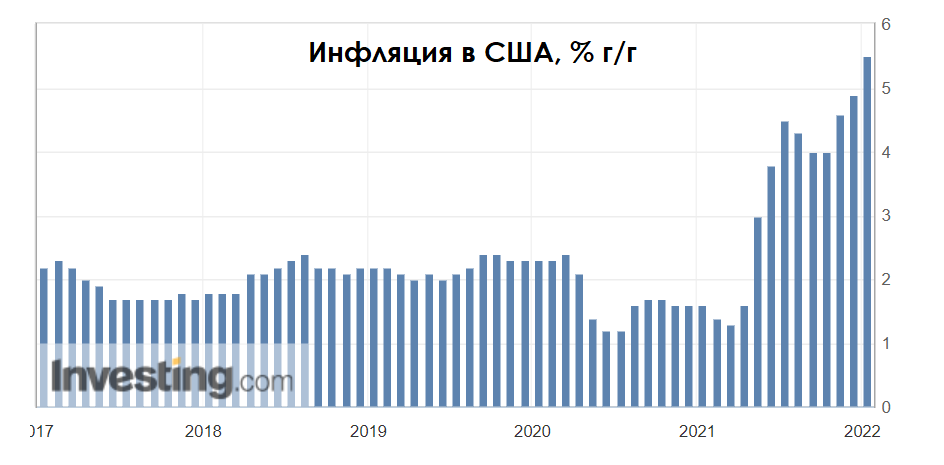 Сегодня целевой уровень инфляции ФРС составляет 2%. 12 января базовый индекс потребительских цен составил 5,5% г/г против предыдущего значения в 4,9% г/г и прогноза в 5,4% г/г: