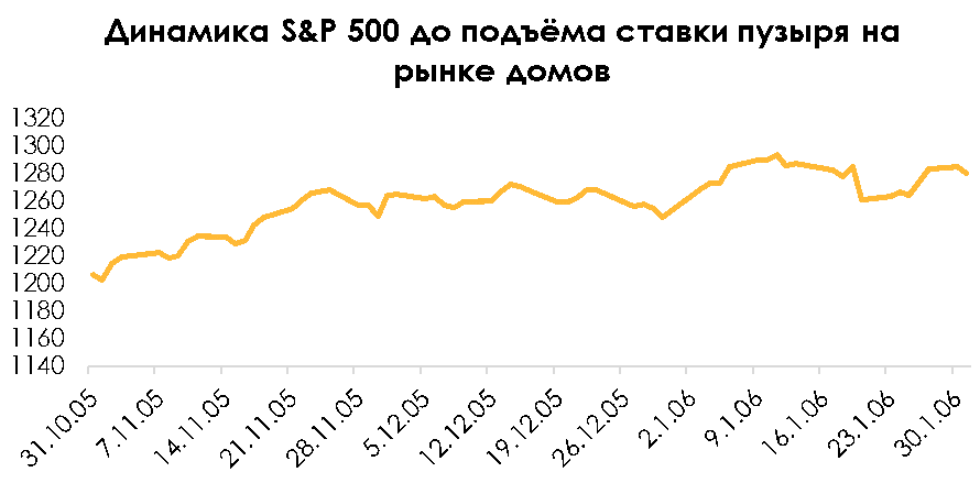 Реакция рынка на рост ставки во время пузыря рынка жилья была уже совсем другой, чем при реакции рынка во время роста ставки времен доткомов. В первых двух случаях повышения ставки рынок находился в боковике в периоде 4 месяцев. Падение рынок увидел только во время 3 и 4 подъёма ставки, и то рынок сократился на 5%, но через два месяца уже восстановился до уровней начала года. Итого на этом цикле рынок находился в боковике на всем периоде роста ставки на протяжении 6 месяцев, что можно увидеть и во время кризиса доткомов.