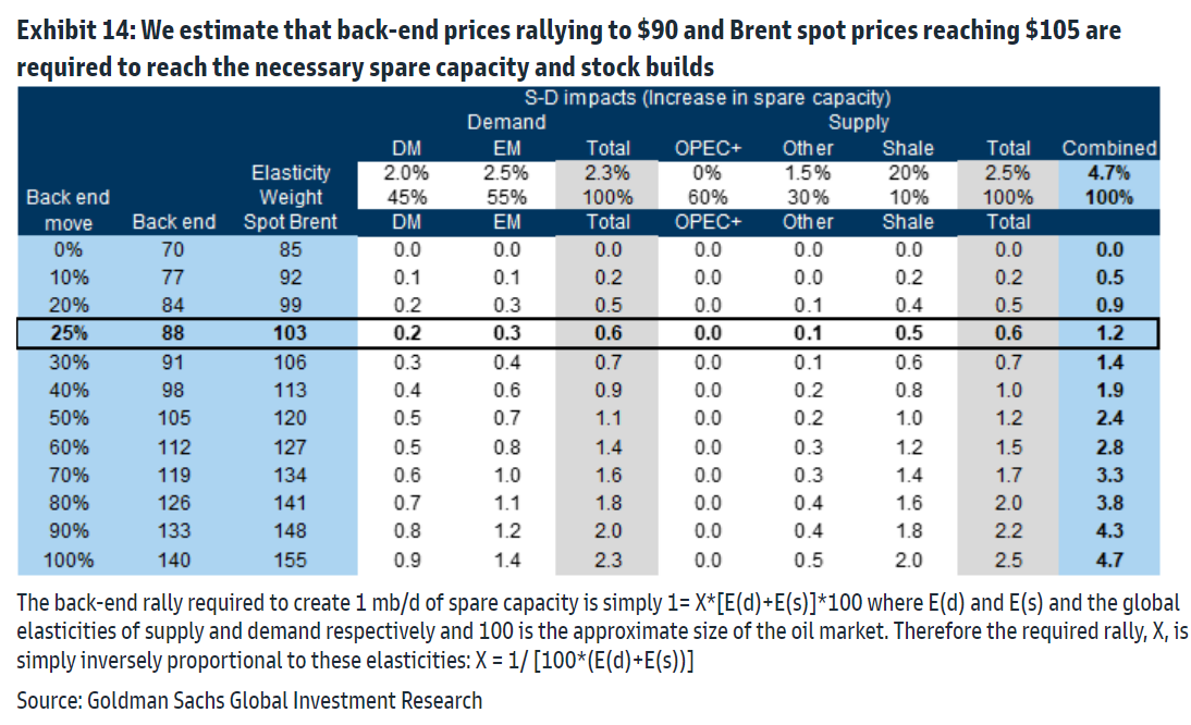Goldman Sachs ожидает, что такая ситуация, в которой цены на нефть будут расти до $100/барр. возможна к середине года, когда, по прогнозу инвест банка, на рынке будут одновременно очень низкие уровни свободных мощностей ОПЕК (около 1.2 мбс) и запасов нефти (около 2.6 млрд барр.). Goldman Sachs прогнозирует, что высокие цены будут сохраняться в течение 2023 года, а при более низких ценах ($85/барр., предыдущий прогноз Goldman Sachs) рынок будет оставаться на минимальных уровнях запасов и свободных мощностей с 2000 г.