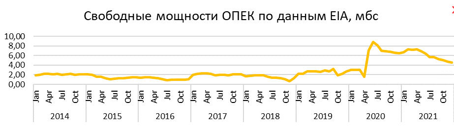 У разных источников на данный момент разные оценки свободных мощностей ОПЕК+. Так, представители ОПЕК, по данным Российской газеты, в ноябре 2021 г. заявляли, что свободные мощности составляют 5.5 мбс. В таком случае в январе 2022 года свободные мощности должны составлять около 4.9 мбс. По данным EIA, на январь 2022 года свободные мощности ОПЕК составляют 4.6 мбс.