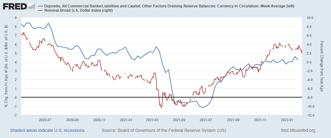 Синяя линия – это соотношение депозитов к наличным деньгам. По сути – если отбросить нюансы, – это один из денежных мультипликаторов. И мы видим, что показатель остается выше нуля, но динамика боковая, что, как минимум, не дает доллару сильно снизиться.