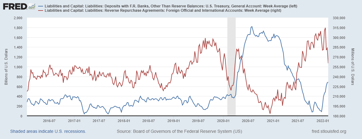 Синяя линия – счет Казначейства США в ФРБ (среднее значение за неделю). На текущей неделе объем средств на счете вырос на 10 млрд долларов. Минфин продолжает цикл наращивания счета – на прошлой неделе было принято решение до конца марта повысить лимит до 750 млрд долларов.