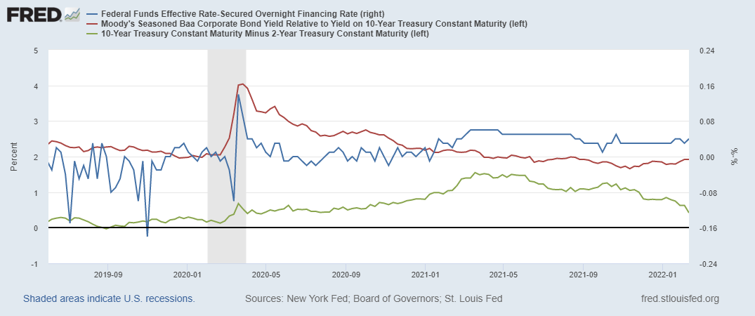 Зеленая линия – это спред между ставками 10-летних и 2-летних трежерис; мы видим, что данный показатель уже подошел к посткризисным минимумам, причем движение достаточно агрессивное. Таким образом, кривая доходности в США начинает быстро уплощаться, что обычно приводит к рецессии и финансовому кризису.
