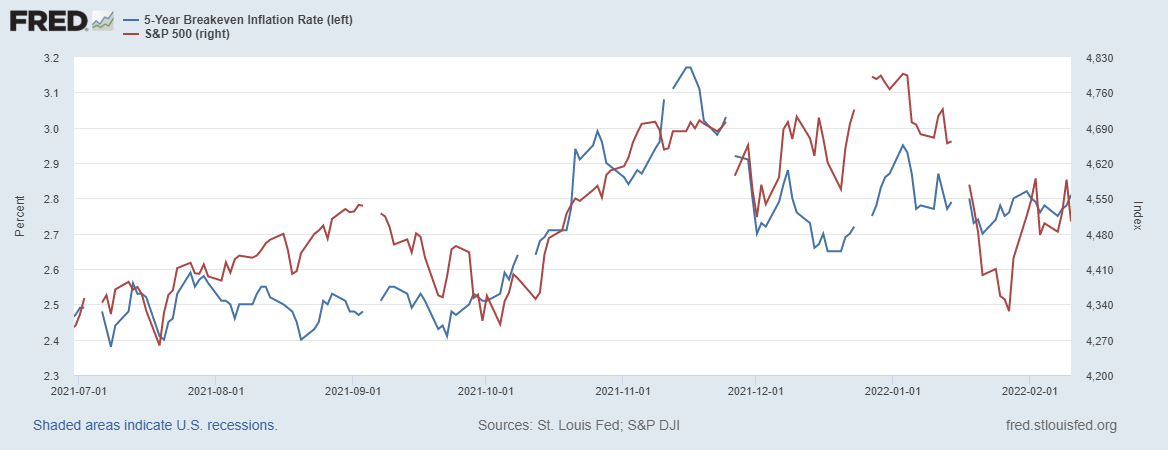Красная линия – индекс S&P500; здесь мы наблюдаем неплохую корреляцию между показателями, но также видим, что на сегодня фондовый рынок падает, отвязавшись от инфляционных ожиданий. В декабре наблюдалась обратная ситуация, которая привела к снижению цен на акции.