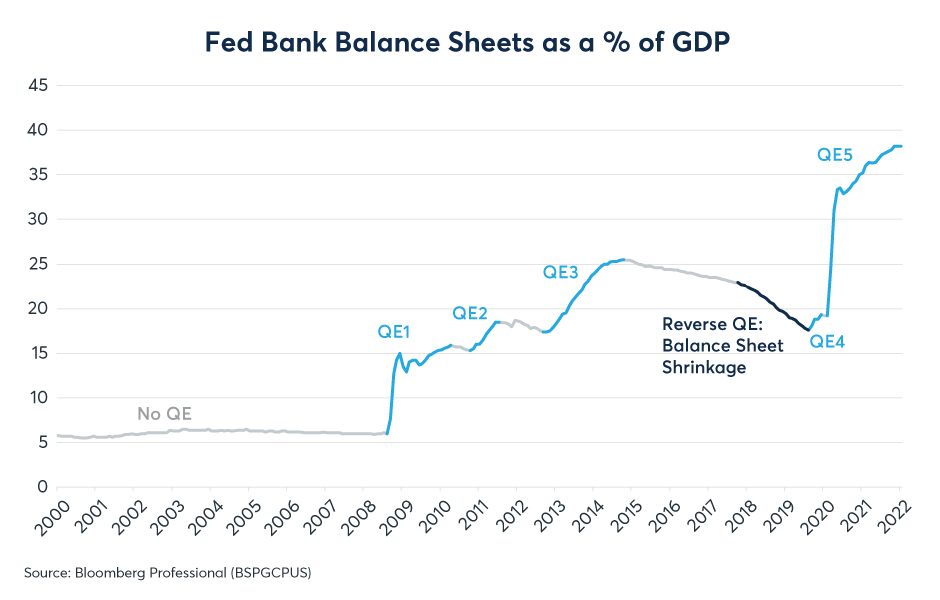1. Баланс ФРС США в проценте от ВВП. Раунды QE отмечены синим, а QT черным, серые участки подразумевают отсутствие как QT, так и QE.