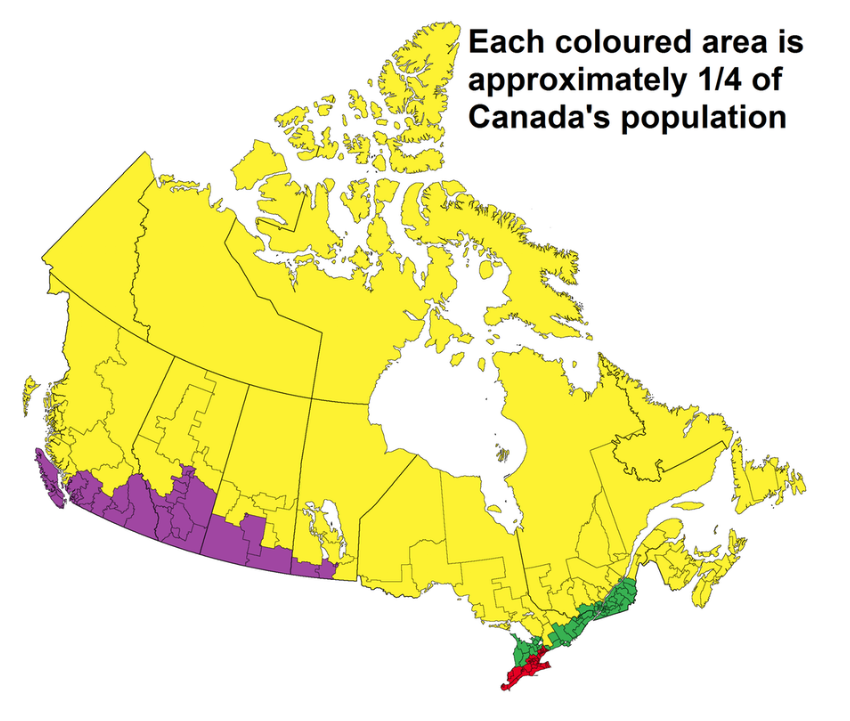 А это Канада, где 90% населения живёт на расстоянии 100 км от границы с США: