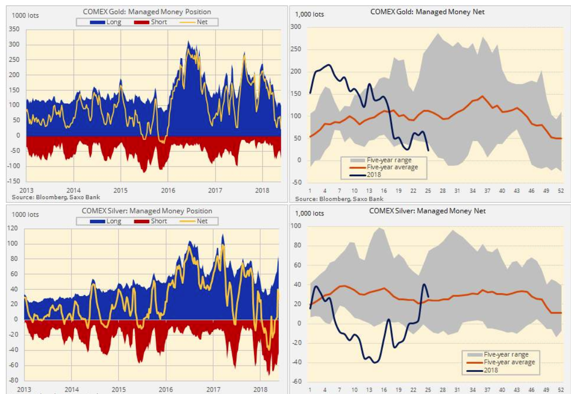 Распродажа в золоте 15 июня привела к 65% сокращению бычьих позиций до 23,5 тыс. лотов. Ставки на рост в серебре же напротив выросли: