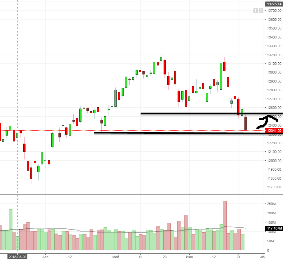 Как известно у сбербанка высокая корреляция с мировыми рынками. Тон в европе сейчас задаёт DAX, дакс при этом упал сегодня в район своей поддержки у 12300 пунктов. В этом месте пока предполагается отскок в оайн 12500 пунктов: