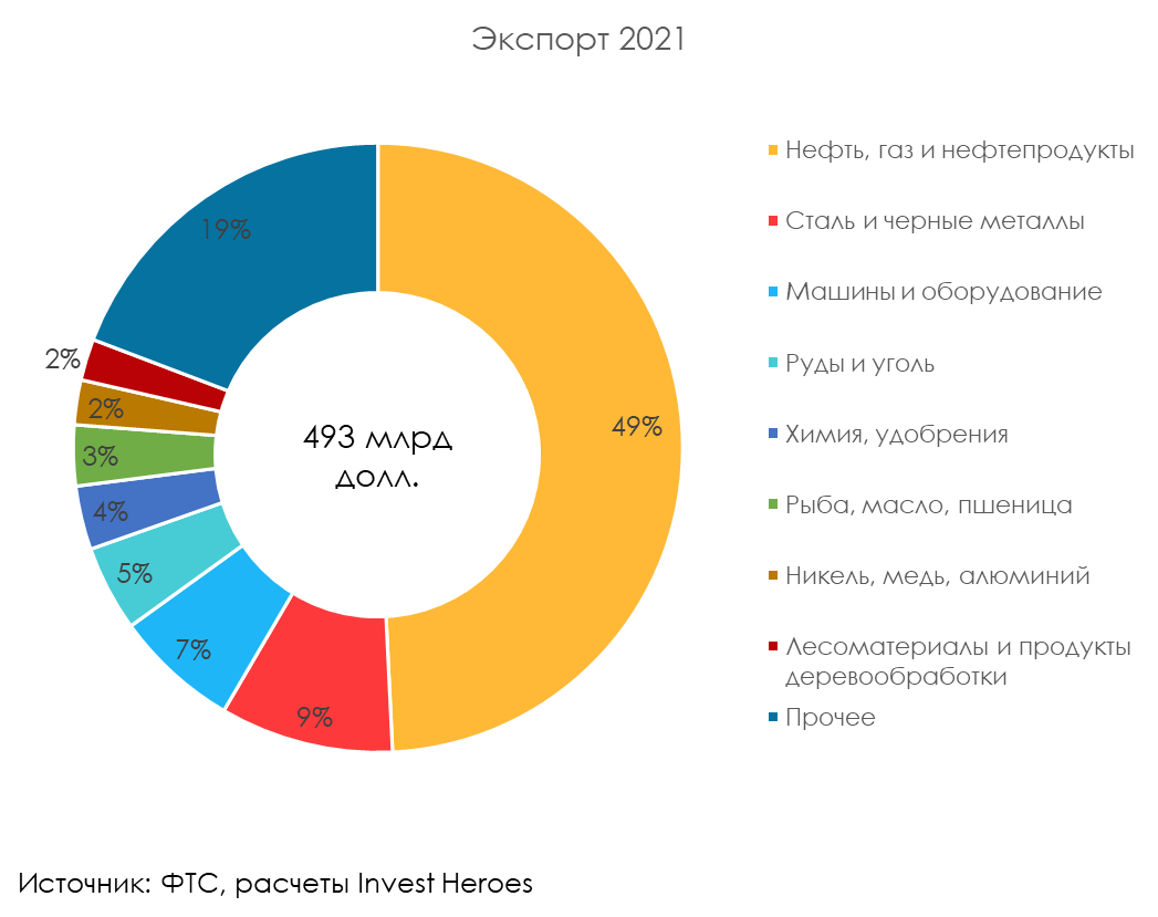 - Нефть – крупнейший покупатель российской сырой нефти – Китай, поставки туда, вероятно, сохранятся и увеличатся по мере решения логистических проблем (сейчас с поставками могут быть проблемы из-за ухода оператора перевозок Maersk, который в том числе обслуживал китайское направление). Второй большой покупатель – Евросоюз. На долю стран ЕС в физическом выражении приходилось 47% экспорта из РФ. В случае остановки импорта нефти из России в ЕС будет нехватка бензина, авиакеросина, продуктов нефтехимии (масла, шины, упаковка и др.).