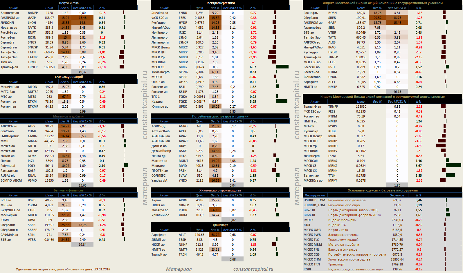 Динамика акций за текущий день, в структуре отраслевых индексов, и индексов государственного сектора.