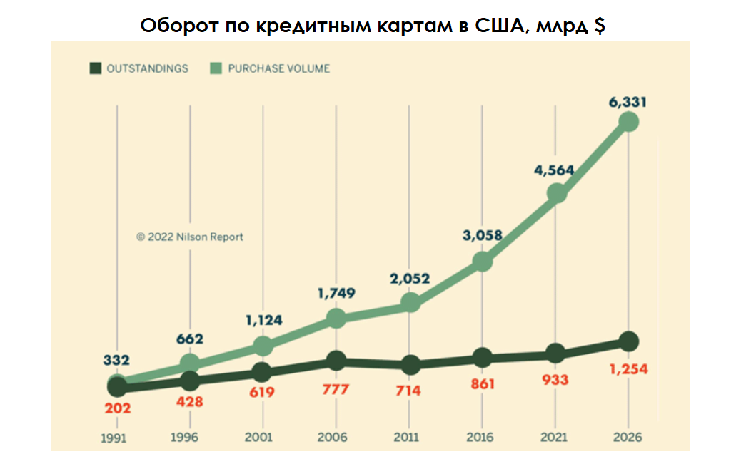 Около 60% ВВП США — это потребительские расходы. При этом 65% населения США имеет кредитные карты, объём покупок по которым составляет, по данным Nilson Report, около $4,5 трлн. Это примерно 20%-25% от всего ВВП США.