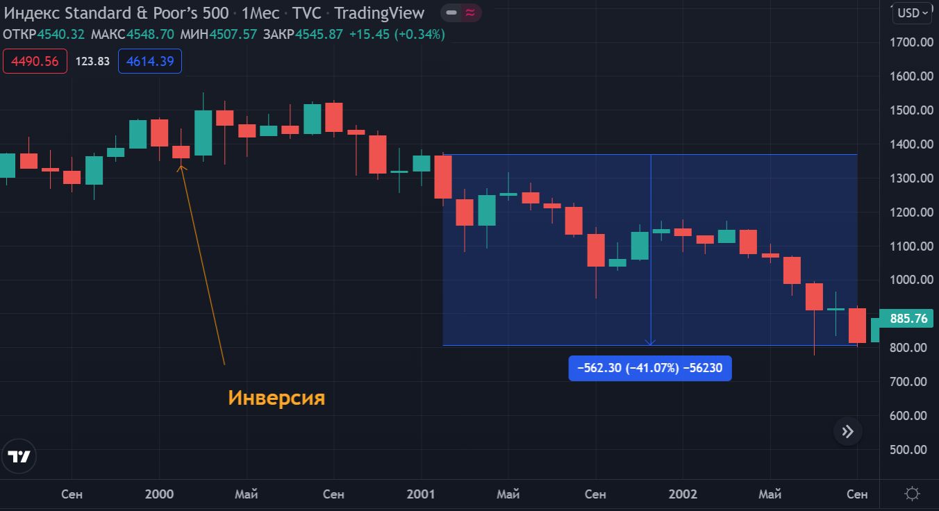 Примерно аналогичную ситуацию можно наблюдать и во время кризиса 2001 года. Инверсия кривой произошла в феврале 2000 года, а рецессия началась спустя почти год — в феврале 2001 года. При этом S&P 500 за год до рецессии почти не изменился в цене, но в период рецессии с февраля 2001 года по сентябрь 2002 сократился более чем на 40%.