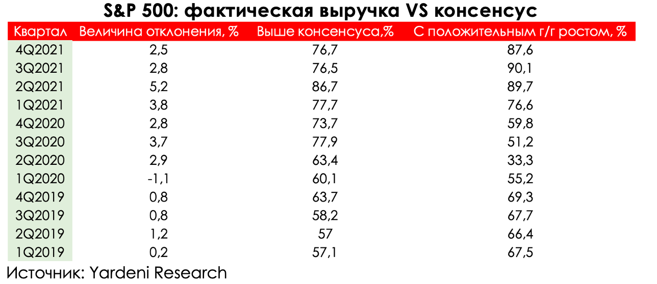Фактическая выручка компаний превзошла консенсус-прогноз на 2,5%, что стало минимальным результатом за последние 6 кварталов. Однако значение показателя все еще выше среднего расхождения. Обычно расхождение между прогнозом и консенсусом составляет около 1%. Более того, около 87,6% компаний отчитались о положительном росте выручки в годовом выражении, что во многом обусловлено двумя немаловажными факторами, которые не повторятся в будущем: эффектом низкой базы 2020 года, а также кульминацией роста экономики США.