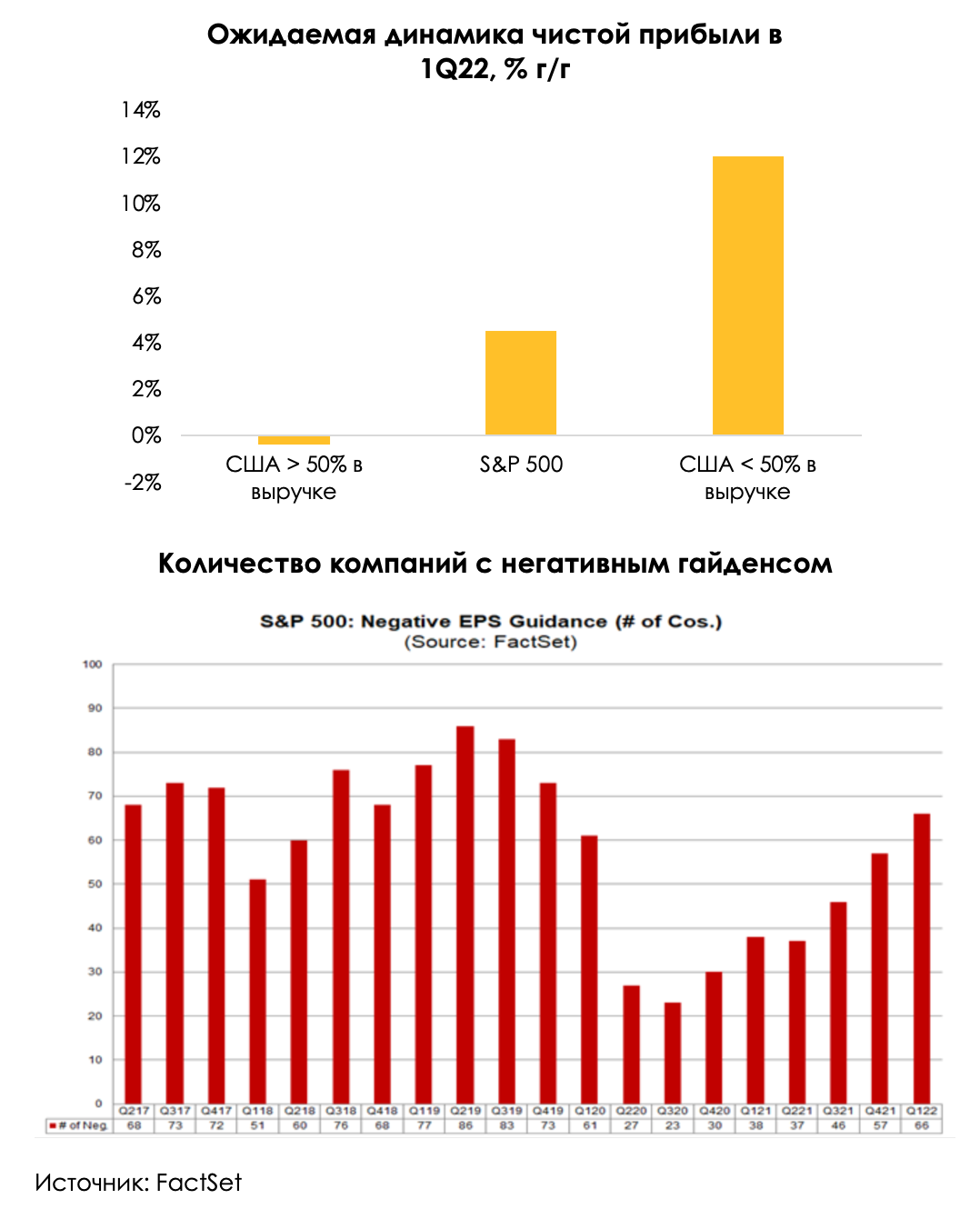 Что примечательно, компании с высокой экспозицией на рынок США (выручка с США более 50%) покажут в среднем отрицательную динамику по чистой прибыли в ближайший квартал, а менеджмент рекордно негативно смотрит на будущие результаты. На 1 кв. 2022 года количество компаний, снизивших прогноз по своим ожиданиям по чистой прибыли, оказалось наивысшим за последние 7 кварталов.