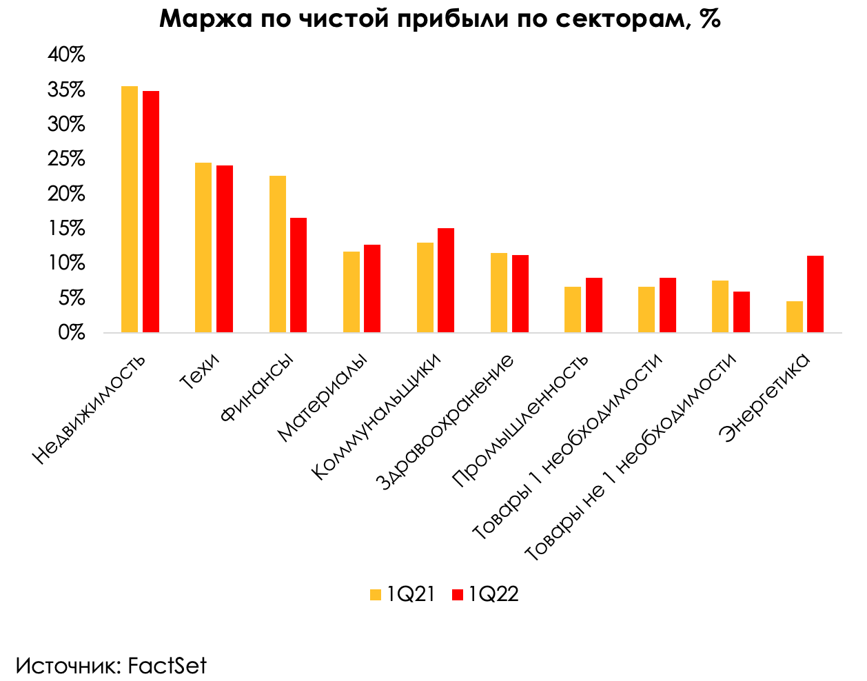 Согласно консенсус-оценке FactSet, в 1 кв. 2022 года около 50% отраслей покажут снижение маржи по чистой прибыли. Рекордсменом станет финансовый сектор, а именно банки в связи с созданием резервов под кредиты, а также ростом заработной платы сотрудников (около 40% операционных расходов). В свою очередь, за счет рекордной стоимости энергоносителей сектор энергетики покажет рост маржи по чистой прибыли более чем на 700 базисных пунктов.