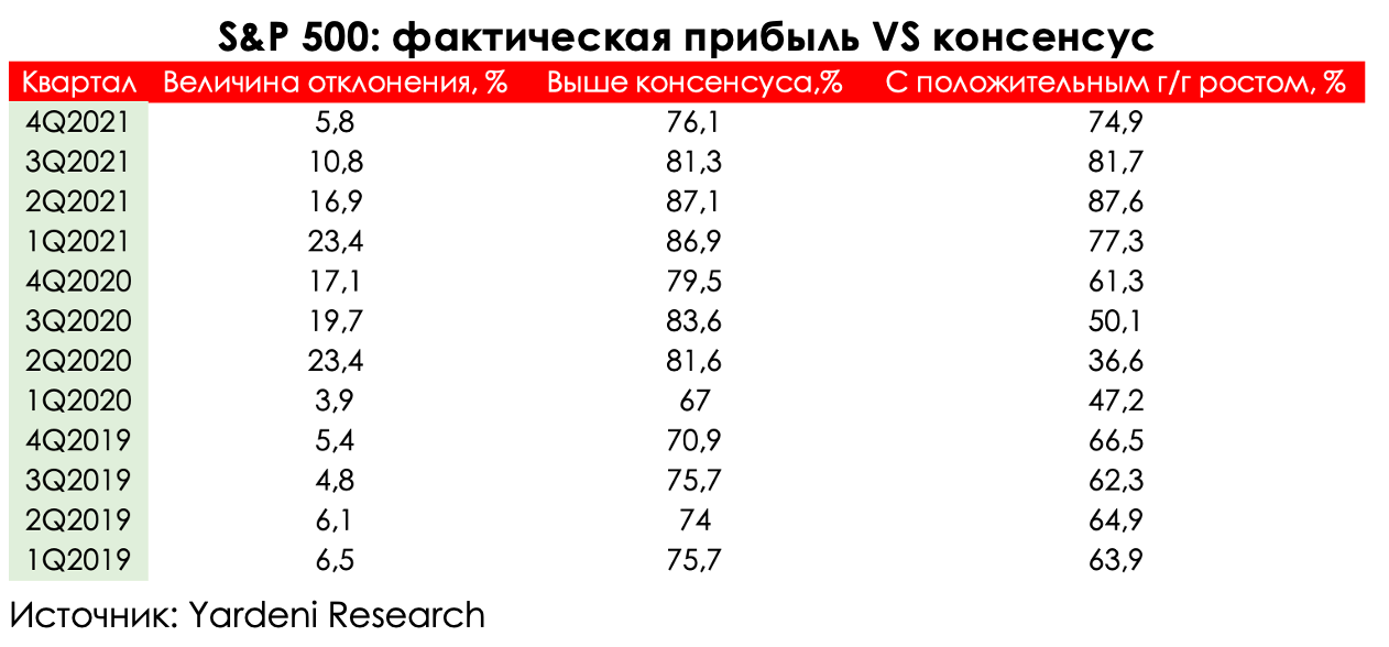 Похожая ситуация, что и с выручкой, наблюдается с результатами по прибыли. Фактическая прибыль компаний превзошла консенсус-прогнозы аналитиков в среднем на 5,8%, что стало минимальным значением за последние 6 кварталов. Что примечательно, по итогам 4 кв. 2021 года резко увеличилась доля компаний с негативным ростом чистой прибыли, что в первую очередь связано с высокой стоимость энергоносителей, труда и материалов.