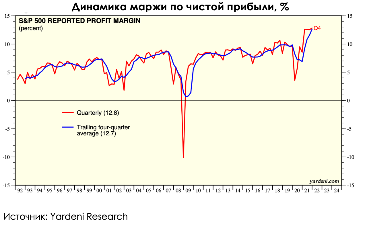 Высокая маржа остается феноменом последних 1,5 лет. По итогам 4 кв. 2021 года, согласно данным Yardeni, маржа по чистой прибыли закрепилась на уровне 12,8%.