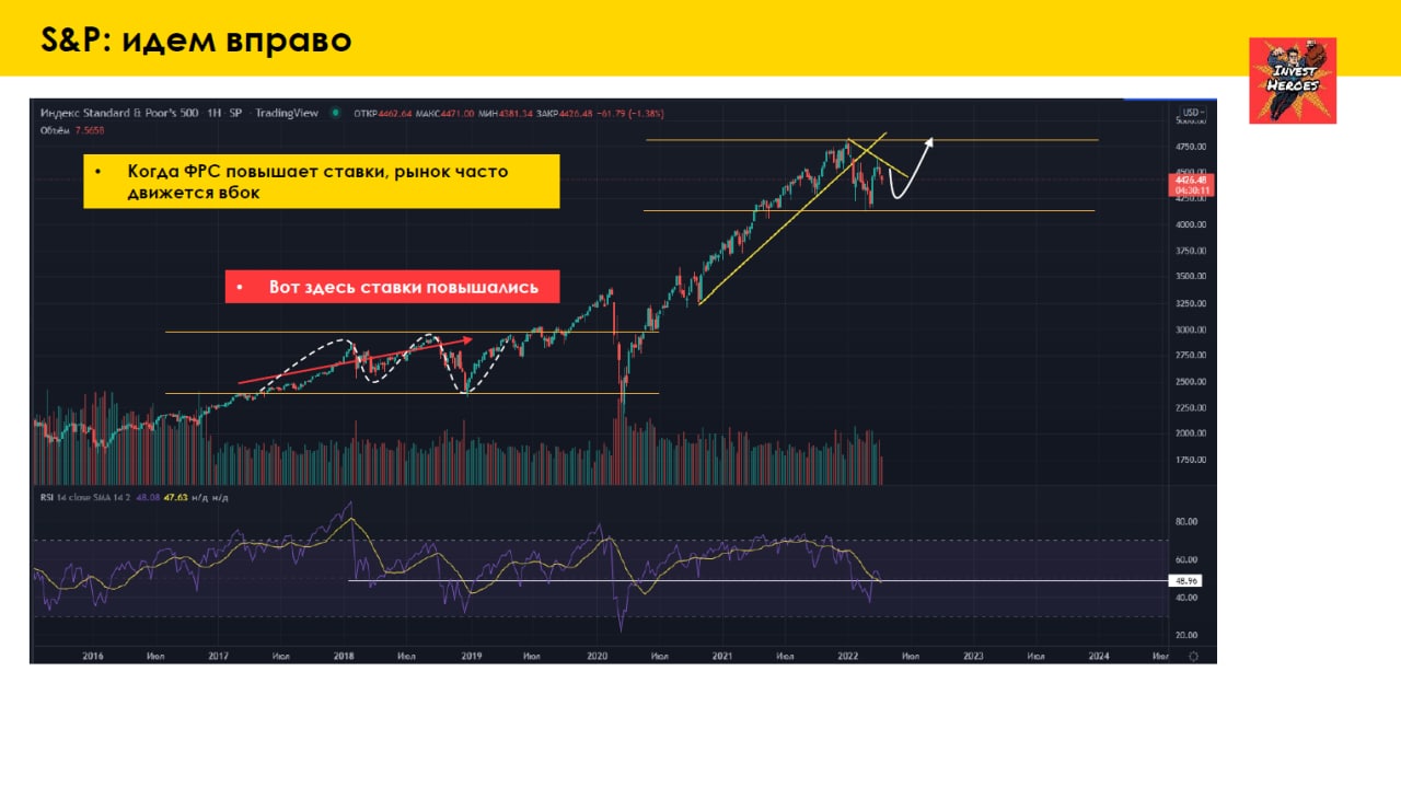 (3) Как золото и рынок вырастут, если готовится 8 повышений от ФРС и изъятие ликвидности? Золото часто растет как раз после 1-го повышения, т.к. в экономике все грустнеет. Рынок США обычно в боковике в это время (см. наш view, обсуждавшийся на эфире, на иллюстрации).