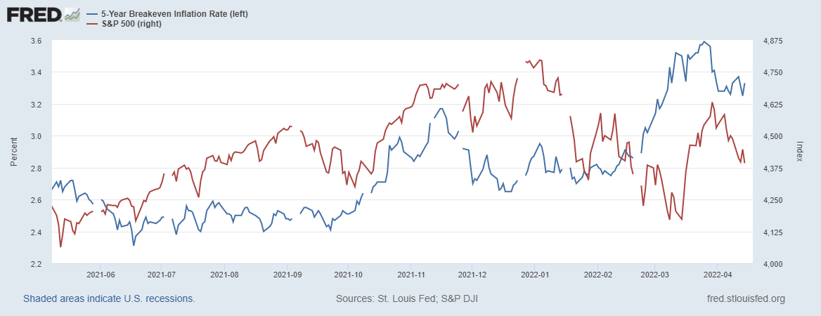 красная линия – индекс S&P 500; мы наблюдаем неплохую корреляцию между показателями: на сегодня фондовый рынок еще больше снизился относительно ожидаемой инфляции, что наводит на мысль о некоторой спекулятивной перекупленности S&P 500 с потенциалом краткосрочного роста.