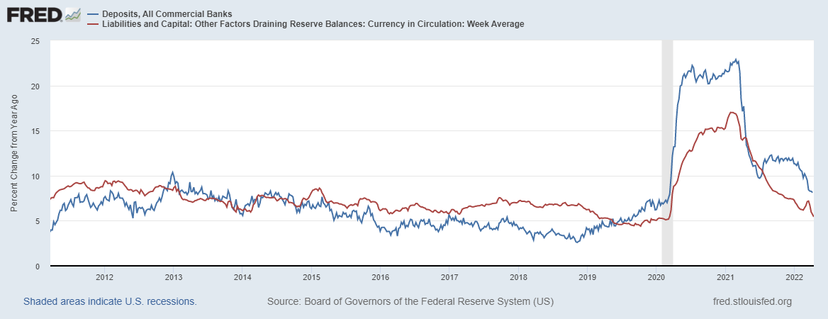 синяя линия – показатель депозитов в финансовой системе США, тоже от года к году: здесь мы тоже видим снижение показателя относительно прошлого года, однако по сравнению с наличными темпы снижения более умеренные.