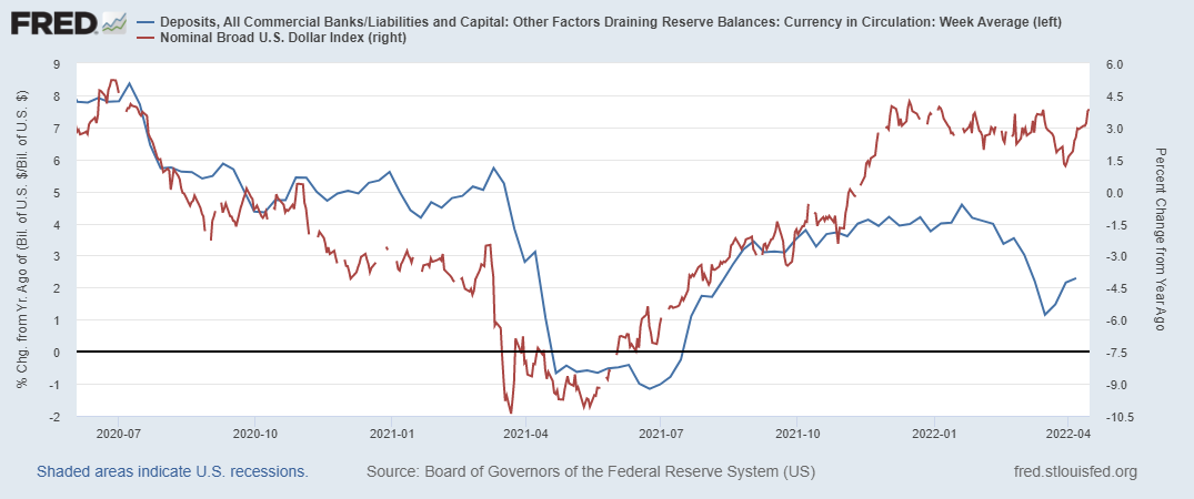 синяя линия – это соотношение депозитов к наличным деньгам; по сути – если отбросить нюансы, – это один из денежных мультипликаторов. Мы видим, что показатель за последние несколько недель вырос, оказывая доллару поддержку (красная линия – это годовая динамика индекса доллара).