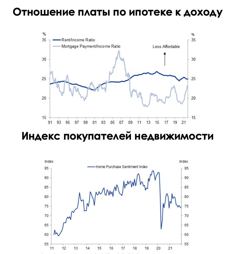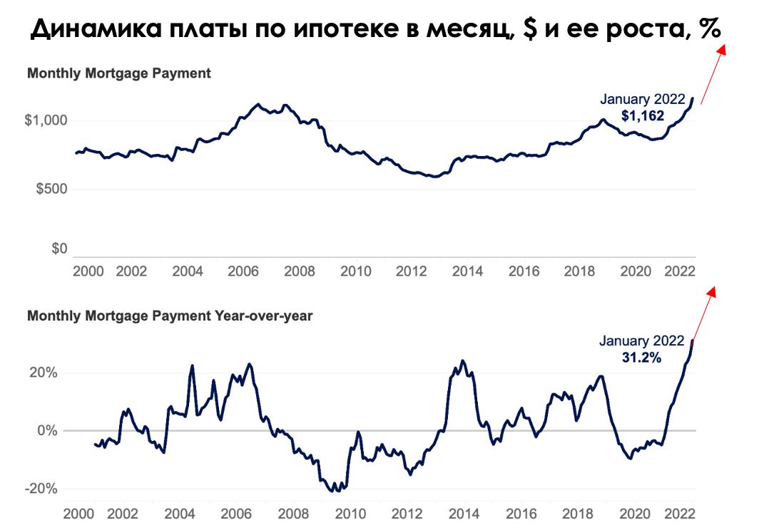 Уже в январе за счет удорожания домов в среднем на 20% г/г, а также роста ставок по ипотеке средняя плата по ипотеке взлетела на 31% г/г до $1162 в месяц, превысив уровни 2008 года, по данным Zillow. А при текущих ставках в апреле (около 4,72%), по нашей оценке, плата по ипотеке для новых заемщиков при условии внесения 20% обеспечительного платежа ускорилась до $1455 в месяц.