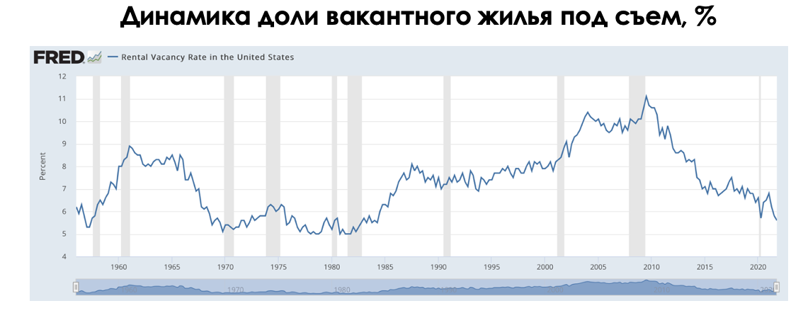 Почему домохозяйства переключаются на съемное жилье? Спрос на аренду вырос ввиду рекордно низкого предложения домов на рынке. Уже сейчас мы видим, что, по данным FRED, доля вакантного жилья под съем опустилась до минимальных значений с 1985 года.