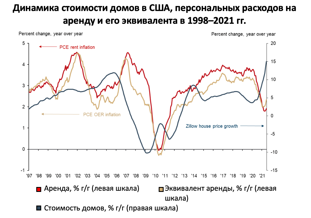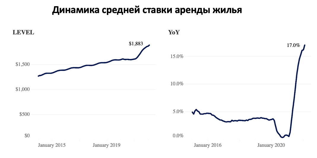 Это связано с тем, что, согласно исследованию Федерального резервного банка Далласа, стоимость арендной ставки и эквивалента арендной ставки в США (сумма арендной платы, которая была бы эквивалентна ежемесячным расходам на владение) реагируют на темп роста стоимости домов с лагом ~ в 18 месяцев. Иными словами, рост стоимости домов в 2021–2022 годах еще полностью не учтен в динамике арендной ставки. Поэтому стоимость арендной ставки сейчас растет на повышенном спросе, а затем рост ставок будет поддержан высокими ценами на дома.