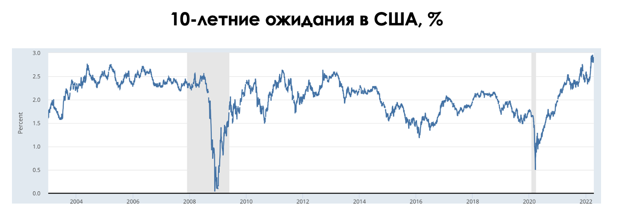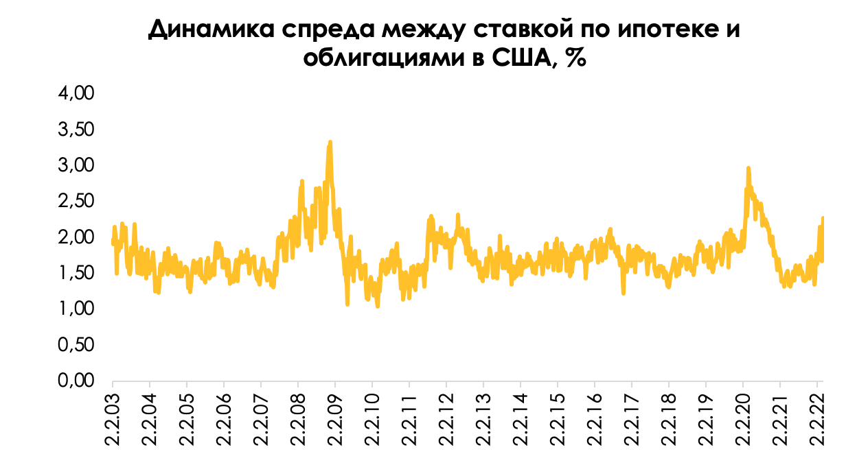 Доходность десятилетних облигаций в США уже достигла 2,72%, и мы считаем, что это не предел и показатель может уйти выше 3% на фоне ускорения инфляции в США в связи усугублением ситуации с разрушенными цепочками поставок в стране, повторным закрытием портов в Китае из-за COVID-19 (поддержит ставки на фрахт в зоне максимума) и сохранением рекордно высоких цен на энергоносители. При сохранении среднего спреда в 250 базисных пунктов ставка по 30-летней ипотеке может достигнуть 5% во втором квартале 2022 года, что будет максимумом с 2008 года.