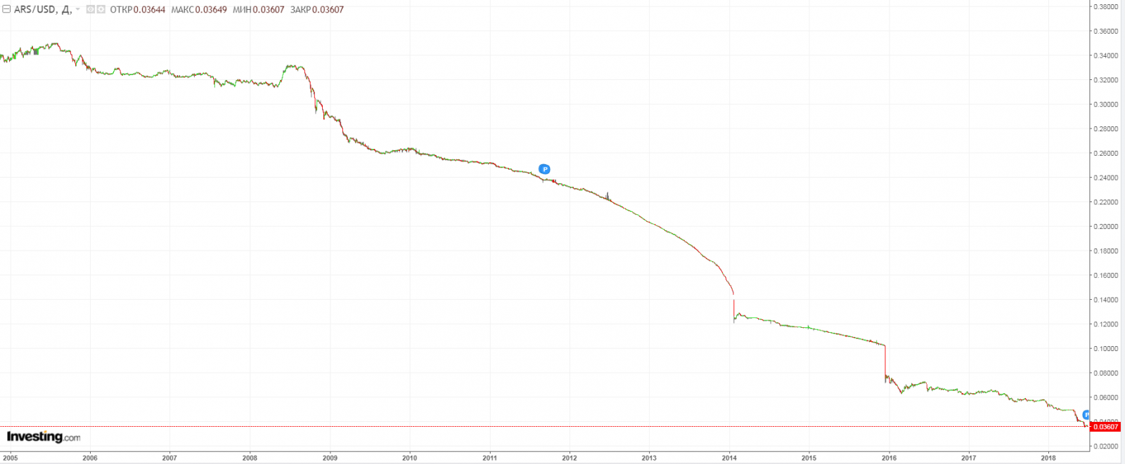 Курс аргентинского песо к доллару. Хочу оставить себе эту картинку на память. Падение в 10 раз за 10 лет. И главное 10 лет падения без отскоков. Это какой то сладкий сон для медведей :) Ставка у них сейчас 40% годовых :) песо 28.06.18 21:44 5293 Krechetov +8 Комментарии Нет комментариев. Ваш будет первым! Войдите или зарегистрируйтесь чтобы добавлять комментарии