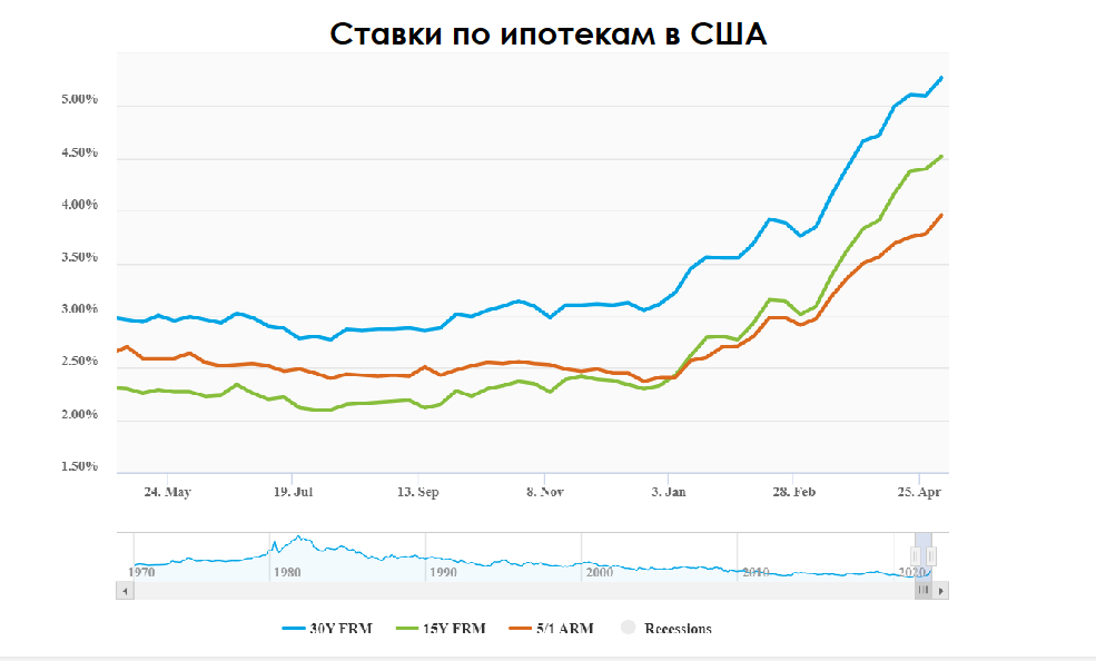 На этом фоне интересно выглядят ноябрьские прогнозы Fannie Mae, Freddie Mac, Ассоциации ипотечных банкиров (MBA) и Национальной ассоциации риелторов (NAR), которые предсказывали, что ставка по 30-летней ипотеке в 2022 году достигнет пика в 4%. Но сейчас она уже 5,3%.