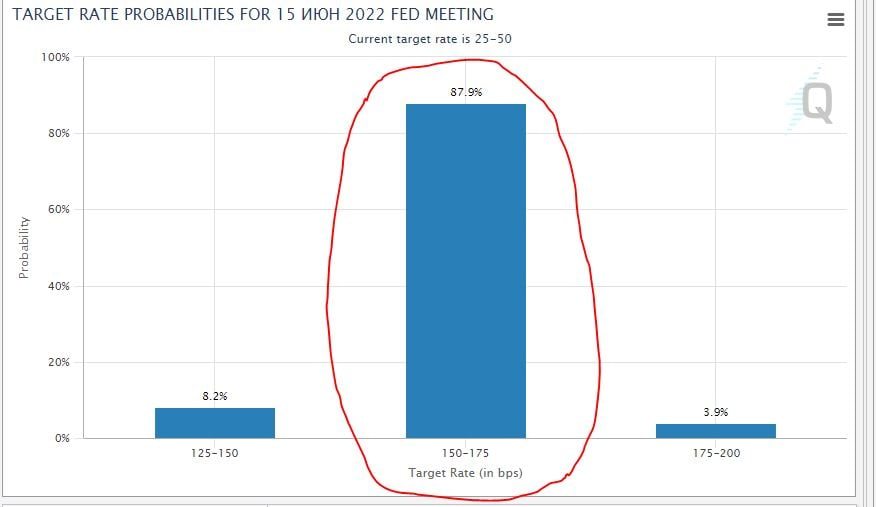 4 мая прошла пресс-конференция FOMC, на которой объявили о повышении ставки на 0,5%. Сейчас ставка ФРС составляет 1%. Рынок ожидал более решительных действий от регулятора — повышения ставки на 0,75%. По крайней мере на 22 апреля рынок закладывал почти 90% вероятность подъёма на 0,75%: