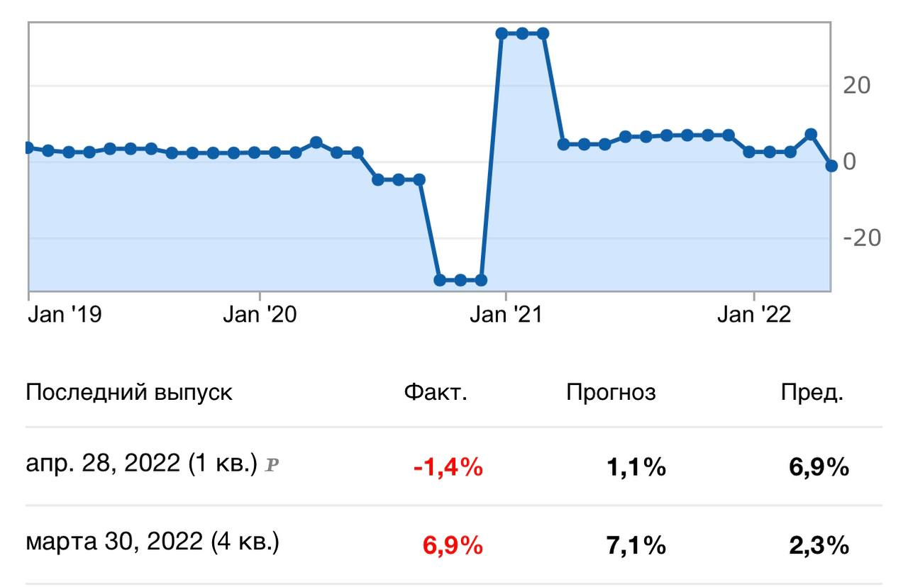 На фоне геополитического кризиса и транспортных проблем в мире ВВП США неожиданно показал отрицательный рост в -1,4% кв/кв против ожиданий +1,1% кв/кв.