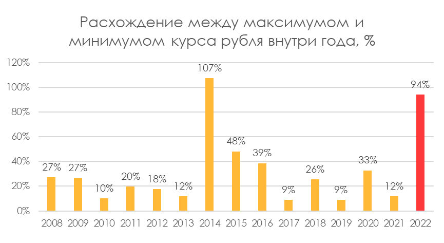 Последний раз такая высокая волатильность курса наблюдалась в 2014 году, однако там движение было только в одну сторону, а внутри 2022 курс уже успел укрепиться в полтора раза и ослабнуть вдвое.
