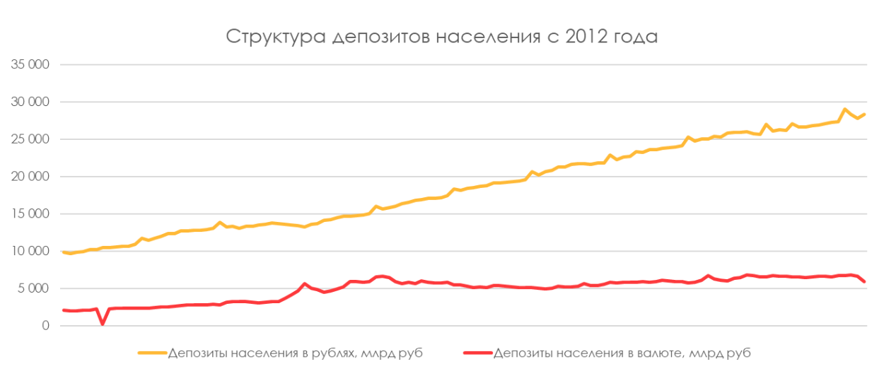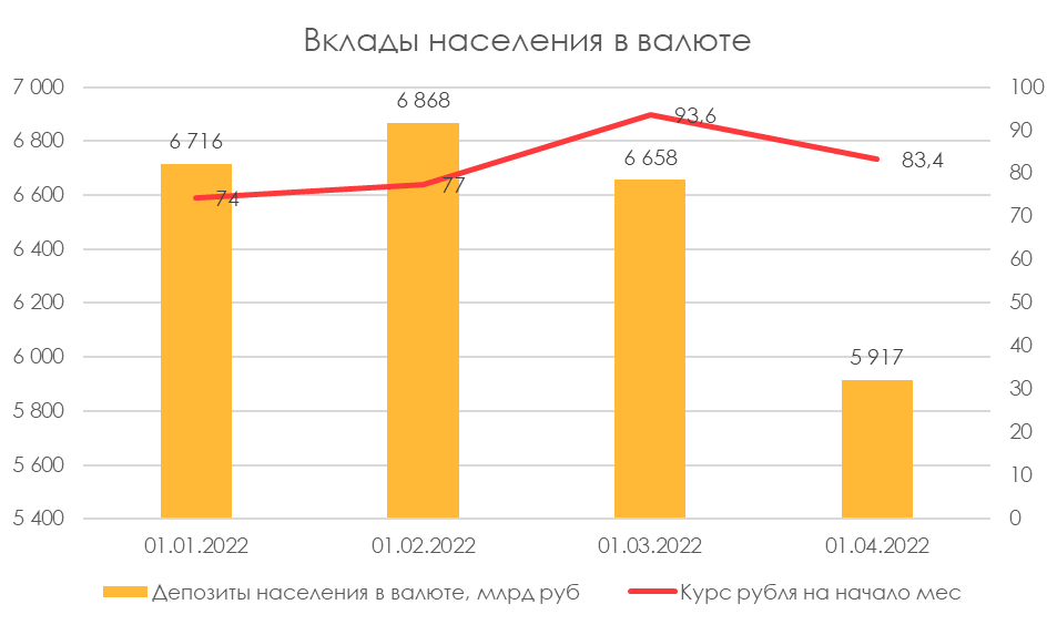 Исходя из изменения курса доллара получается, что в феврале были рекордные продажи долларов населением (чистые продажи валюты населением в феврале по нашим расчетам 1,6 трлн руб.). Скорее всего это был эффект снятия наличных долларов. В марте изменений почти не было, а данных по изменениям депозитов за апрель пока что нет.