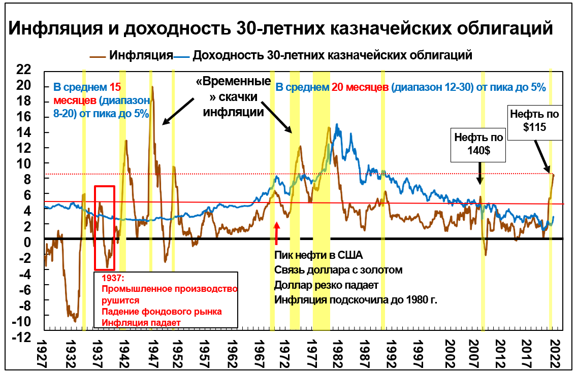 Хотя инфляция снизилась на 0,2%, она не уменьшила долгосрочный импульс, но ее рост значительно замедлился. Инфляция имеет историю циклических пиков, которые выглядят как перевернутая буква V (см. диаграммы). Именно так, прежние всплески инфляции выше 5% с 1927 года обратились вспять.