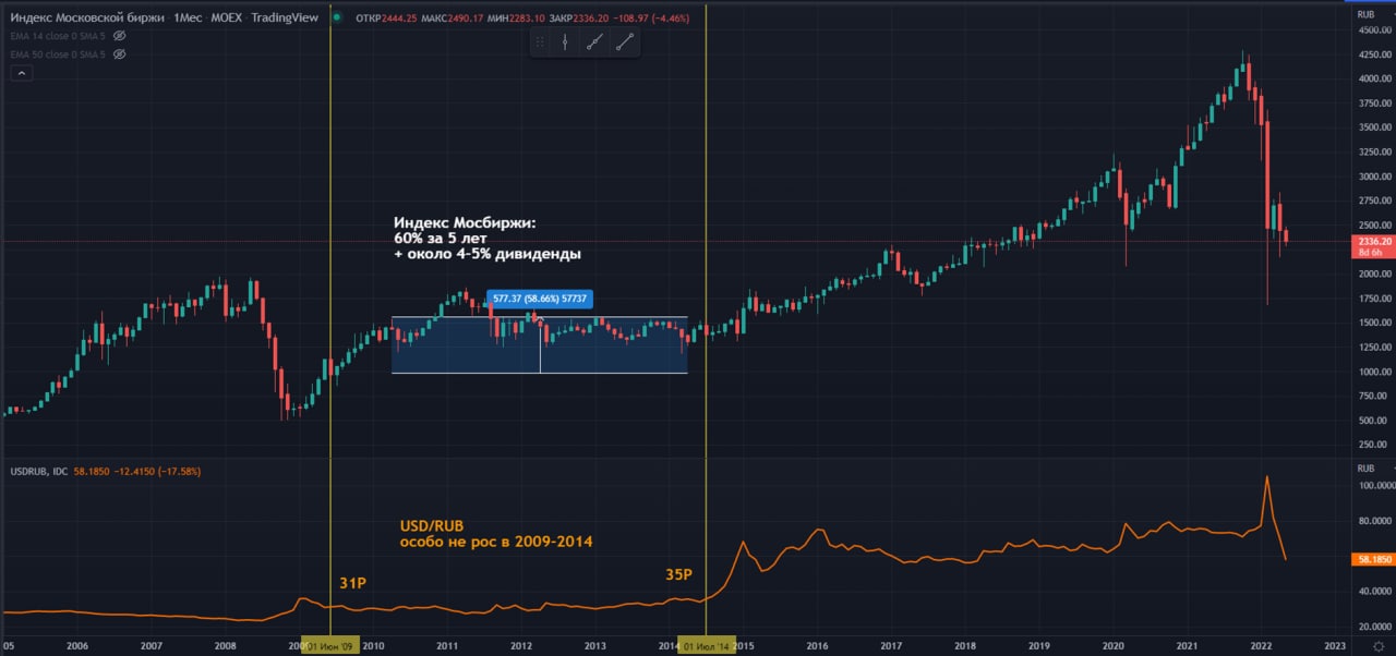 Наверняка есть ещё несколько примеров, но в общем и целом заметно, что это не тяжеловесы индекса. И что-то мне подсказывает, что как раз за счет таких позиций можно обыграть индекс, который на крепком рубле пока что не спешит расти. См. пример такого ранее в 2009-2014: