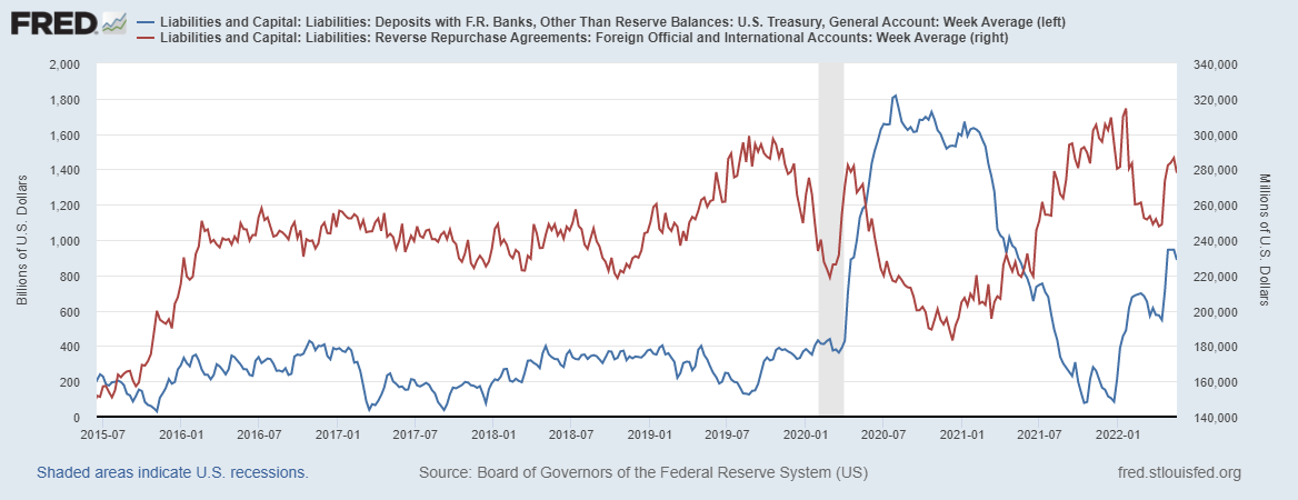 синяя линия – счет Казначейства США в ФРБ (среднее значение за неделю), который на прошлой неделе немного сократился; Минфин пока не вытягивает ликвидность из системы, хотя особо и не раздает;