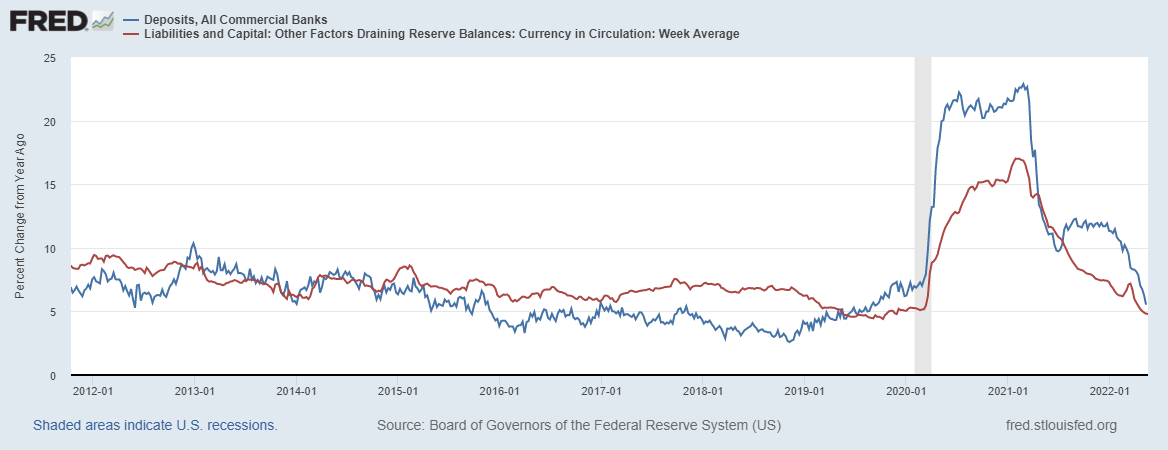 синяя линия – показатель депозитов в финансовой системе США, тоже нанесенный от года к году: и здесь видим снижение показателя относительно прошлого года, но темпы снижения – более умеренные, чем по наличным.