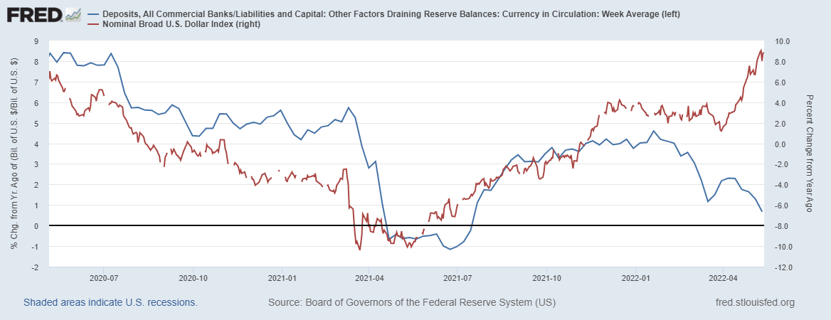 синяя линия – это соотношение депозитов к наличным деньгам, которое, по сути – если отбросить нюансы, – является одним из денежных мультипликаторов: мы видим, что показатель за последние несколько недель снизился, в то время как доллар укрепился (см. красную линию, которой обозначена годовая динамика индекса доллара).